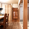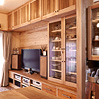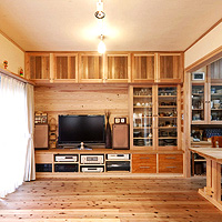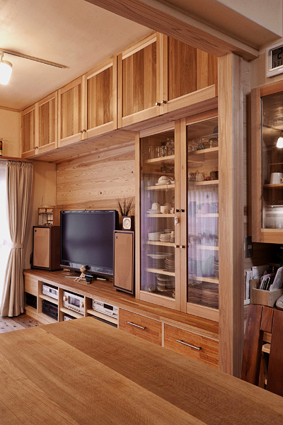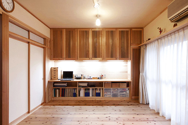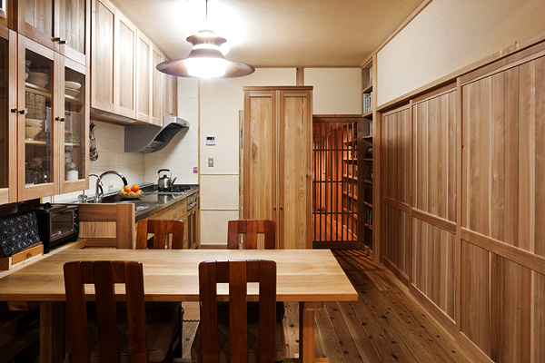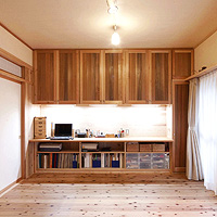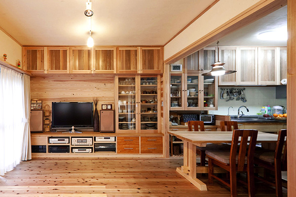 築30年のマンションの改修工事。南側に2室、その奥に台所と和室、その奥に1室と水廻りの4Kの間取りを、間仕切りをすべて取り除いて全面的に改修しました。台所と南側2室を一部屋にして開放的なLDKにして、杉板と左官の仕上げ、作り付け家具は、戸建住宅と同じ仕様です。吸い込みの悪かったレンジフードなど、設備の機能的な改善も行っています。