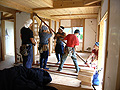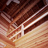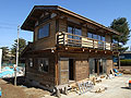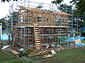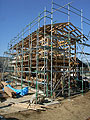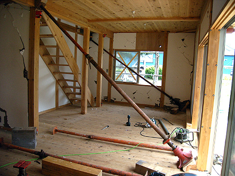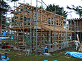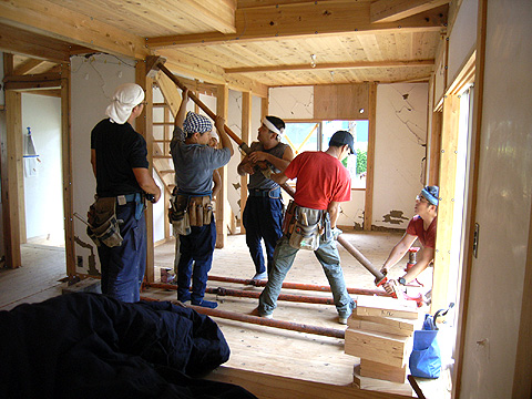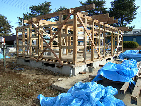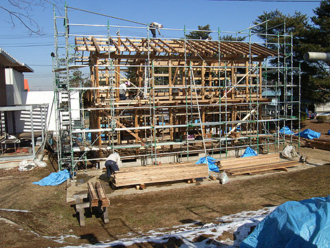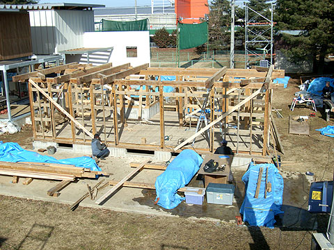 ●2008年1月28日〜2月29日 再築工事 工事が終了しました。 再築した骨組み、屋根、床で再度引っ張り実験を行います。